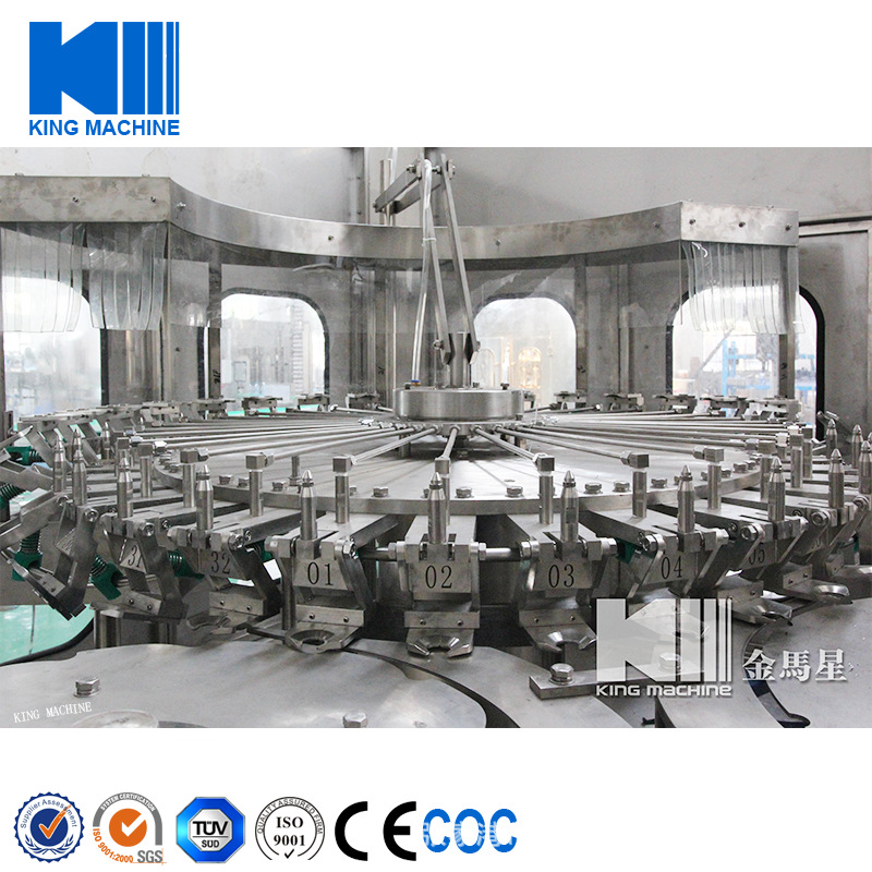 果汁灌裝機同時適用于果汁、茶飲料、功能飲料及果味奶飲料的灌裝。在溫度控制器的幫助下,該機器能夠進行80-95度高溫熱灌裝。本設備采用瓶頸懸掛技術,適用于各種瓶型,跟換瓶型只需調節傳送鏈的高度及出瓶玻璃即可,方便快捷。全機PLC控制變頻調速,自動化程度高,自動控制進液,液位控制準確,無滴漏。與物料接觸部分均為食品級304優質不銹鋼。是飲料廠家的優選產品。